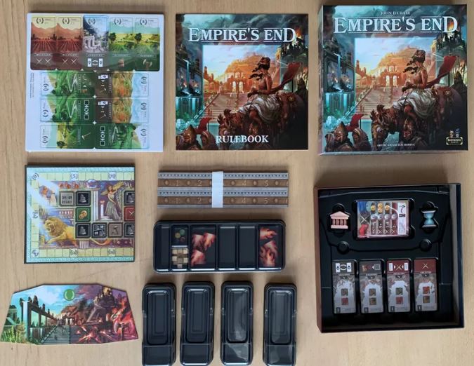 You lead a grand civilization at the height of its influence, but can you save it from collapse? In Empire’s End, 2-4 players compete to keep calamity at bay. Empire’s End marries the intuitive and elegant mechanism of reverse-bidding with engine-building, long-term planning, and strategic depth. The result is a game with a quick tempo, abundant tension, and multiple challenging paths to victory.